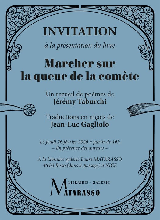 Le jeudi 26 février, de 16h à 18h à la Librairie-Galerie Laure Matarasso, Jérémy Taburchi présentera quelques-uns de ses poèmes réunis dans un recueil façonné, relié et édité par l’Atelier Raise à Nice.